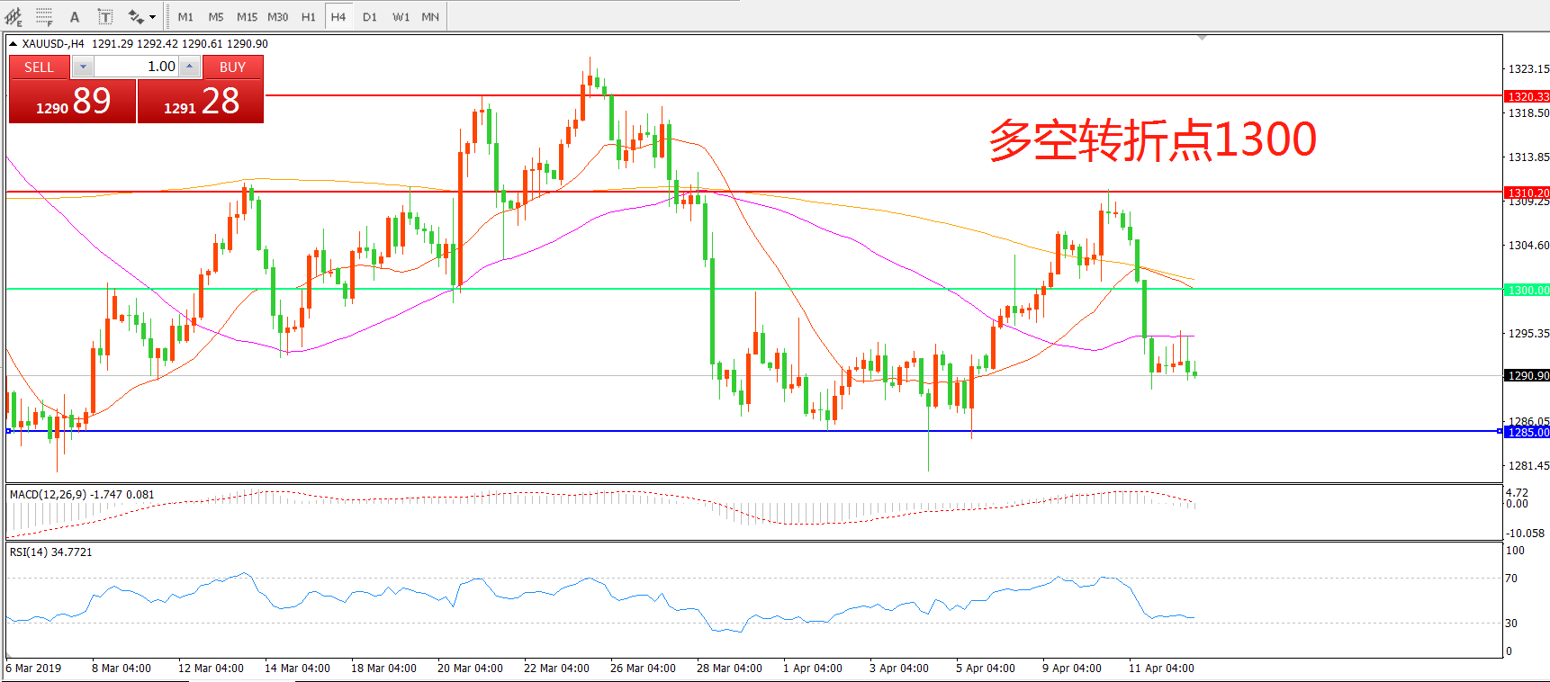 交易策略:在1300.00之下看跌,目标1285.00 1270.00