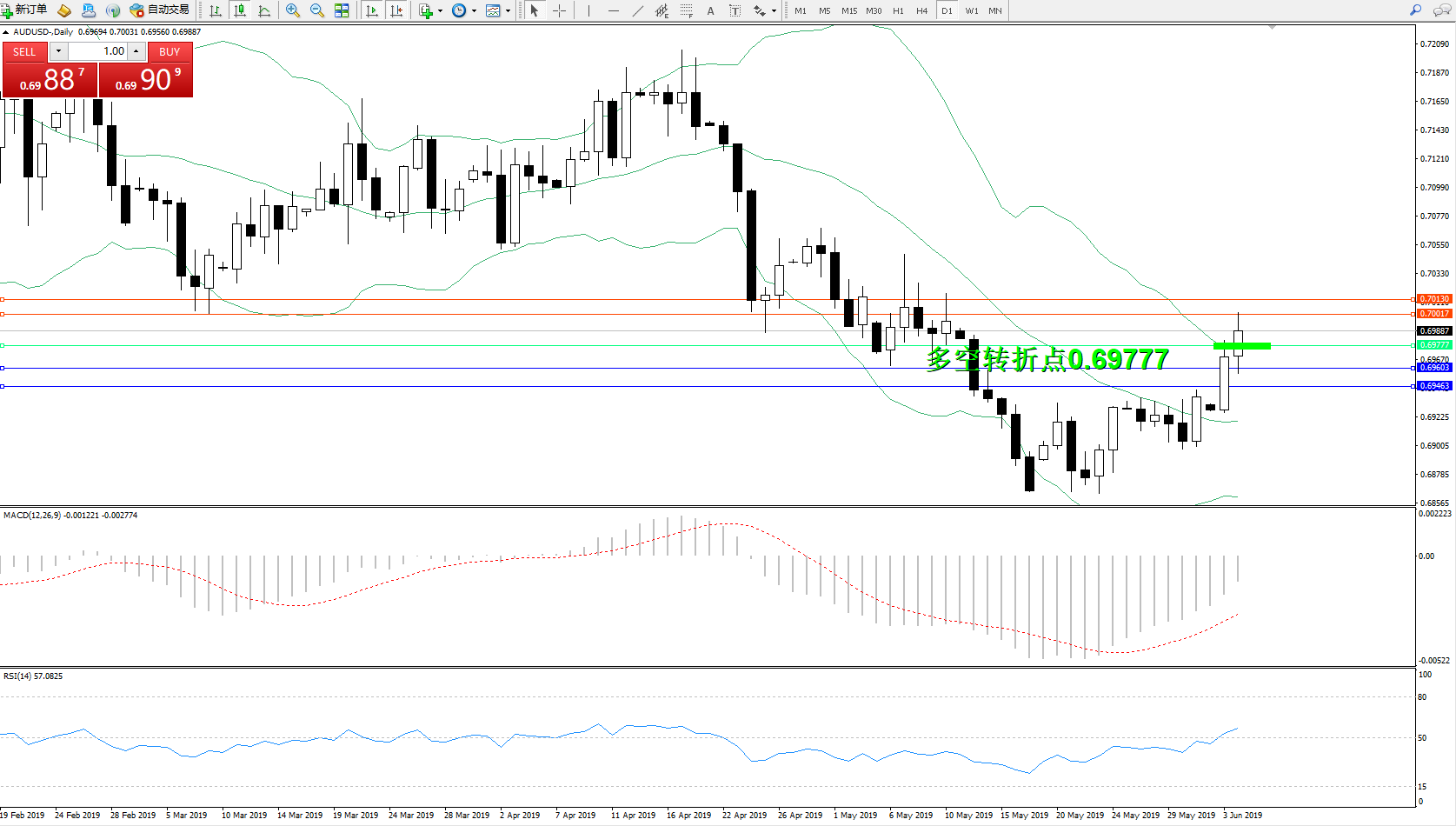 交易策略:0.69777上方看涨,目标0.70017、0.70017