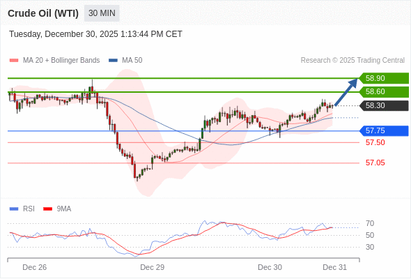 在 57.75 之上,看涨,目标价位为 58.60 ,然后为 58.90 。