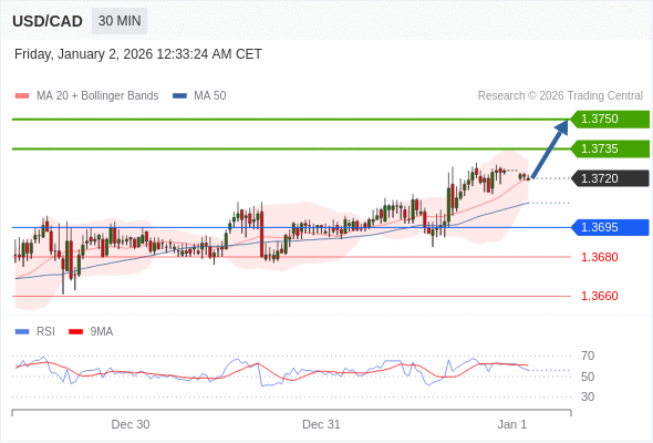 在 1.3695 之上,看涨,目标价位为 1.3735 ,然后为 1.3750 。
