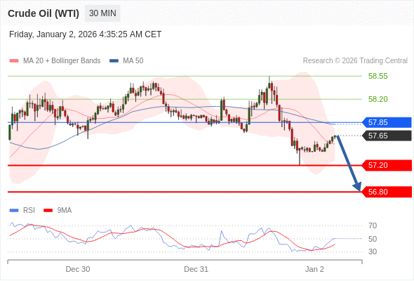 交易策略: 在 57.85 之下,看跌,目标价位为 57.20 ,然后为 56.80 。