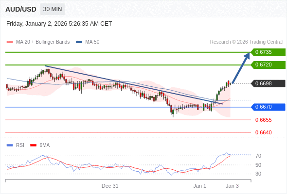 在 0.6670 之上,看涨,目标价位为 0.6720 ,然后为 0.6735 。