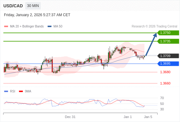 在 1.3695 之上,看涨,目标价位为 1.3735 ,然后为 1.3750 。