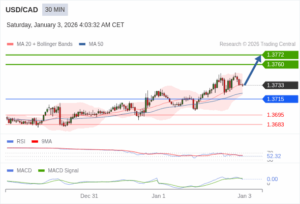 美元/加元 当日内 : 看涨,当 1.3715 为支撑位,目标定在1.3772。