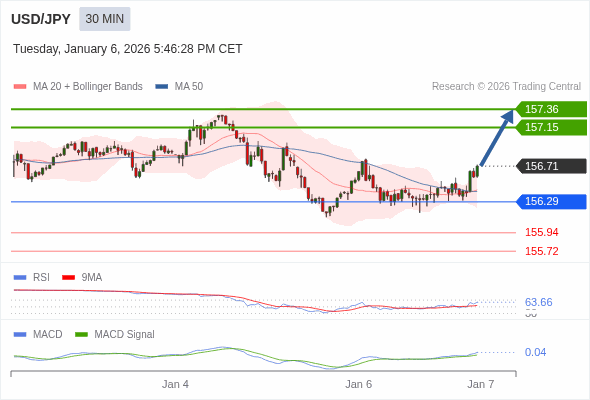 美元/日元 当日内 : 看涨,当 156.29 为支撑位。