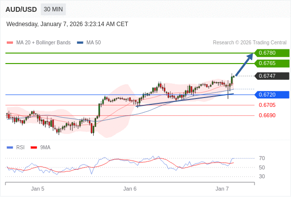 在 0.6720 之上,看涨,目标价位为 0.6765 ,然后为 0.6780 。