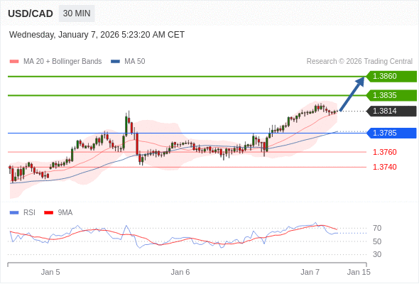 在 1.3785 之上,看涨,目标价位为 1.3835 ,然后为 1.3860 。