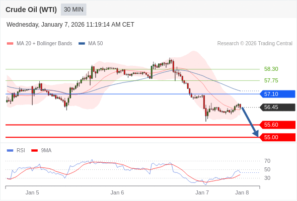 在 57.10 之下,看跌,目标价位为 55.60 ,然后为 55.00 。