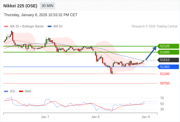 日经225股指期货 (OSE) 当日内: 在51360之上,看涨。