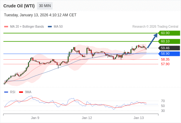 在 58.90 之上,看涨,目标价位为 60.10 ,然后为 60.90 。