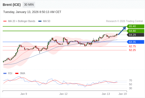 在 63.35 之上,看涨,目标价位为 64.80 ,然后为 65.40 。