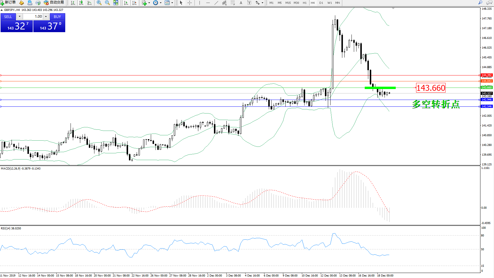 交易策略:143.660下方看跌,目标142.946、142.546
