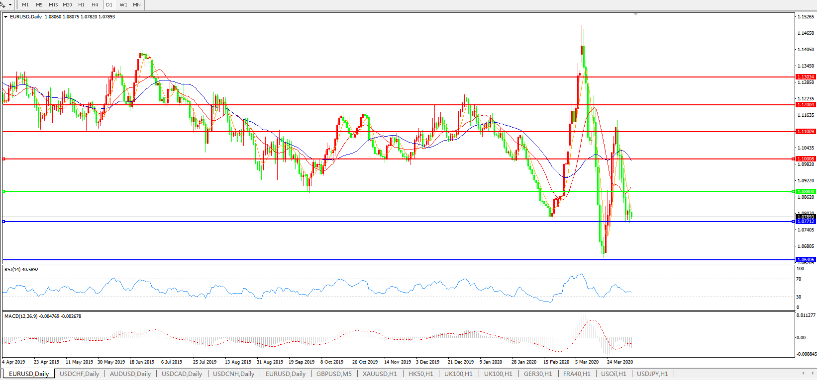 欧元兑美元在周一日内窄幅震荡,进入欧洲时段后再度下跌重新失守1.08关口,整体走势仍然相对疲弱。虽然,周末以来欧美多国发布的疫情数据显示局势有开始好转的苗头,令市场避险情绪降温。然而,美元指数却依旧保持坚挺,令主要对手货币欧元继续处于承压状态;调查显示,今年4月欧元区投资者的信心降至历史最低水平,同时,由于疫情影响,欧元区经济正陷入深度衰退。Sentix公司执行董事称,4月份经济衰退的力度要比3月份大得多,且情况比2009年金融危机时糟糕多了。迄今为止的经济预测低估了经济萎缩的规模,经济衰退的程度会更深,持续的时间也会更长