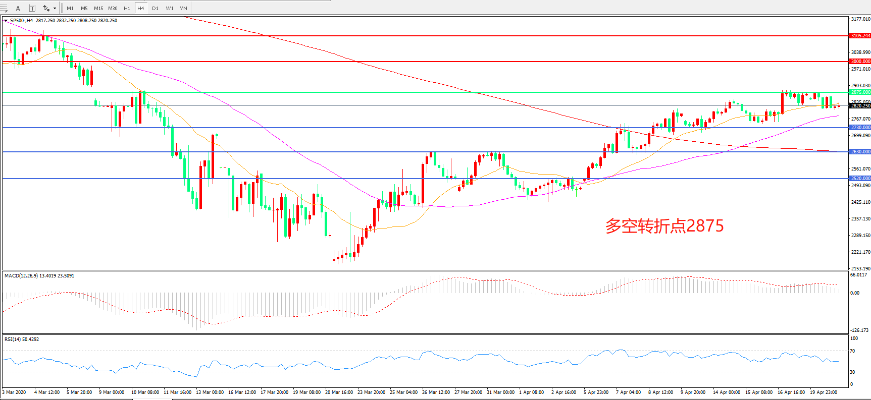 4小时图看,标普延续高位震荡,整体表现较为强势,21周期均线成为下方支撑,2875成为短期阻力,MACD红柱增加,RSI指标走平,日内震荡上行概率较大。