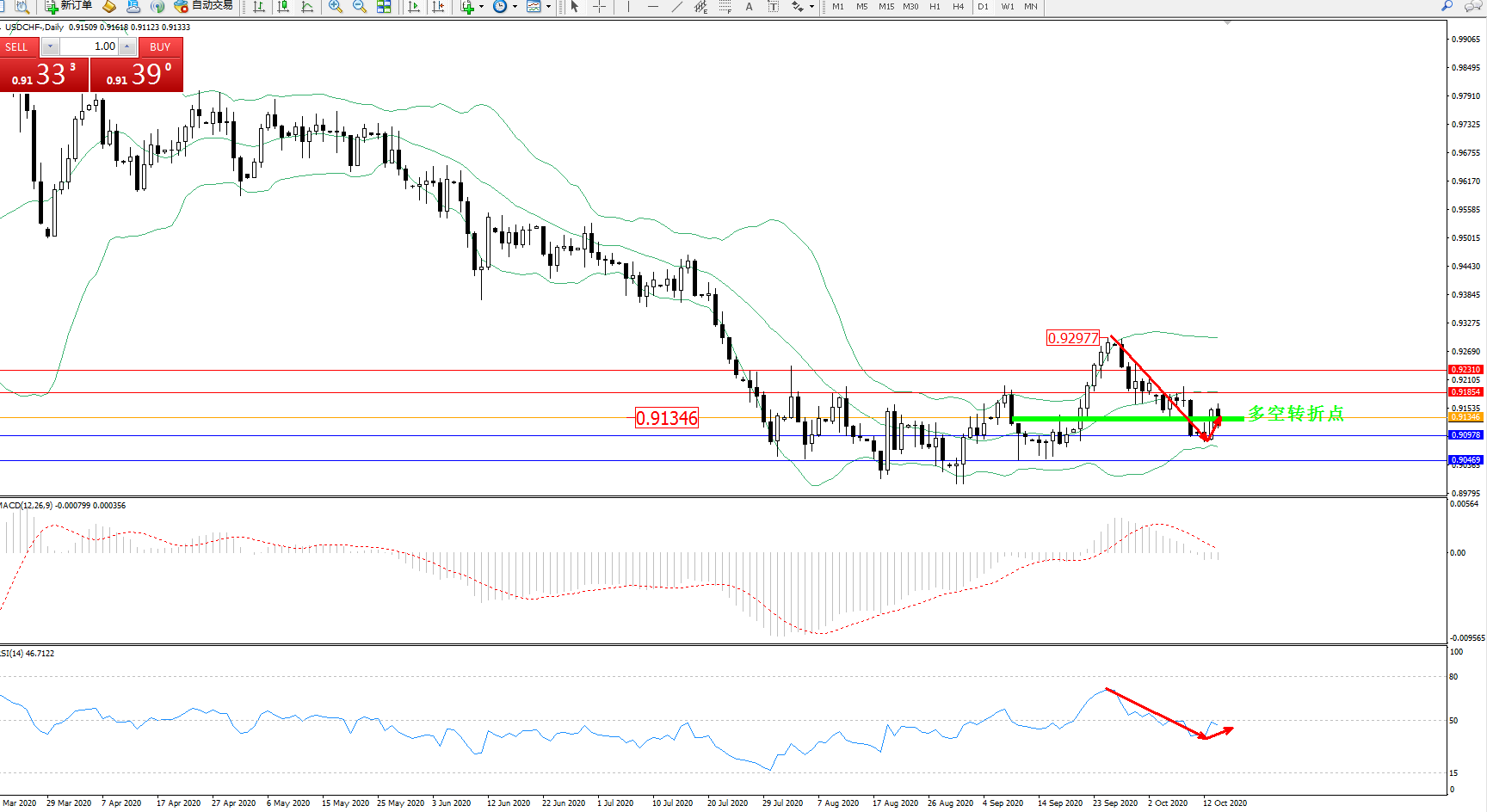 交易策略:0.91346上方看涨,目标0.91854、0.92310