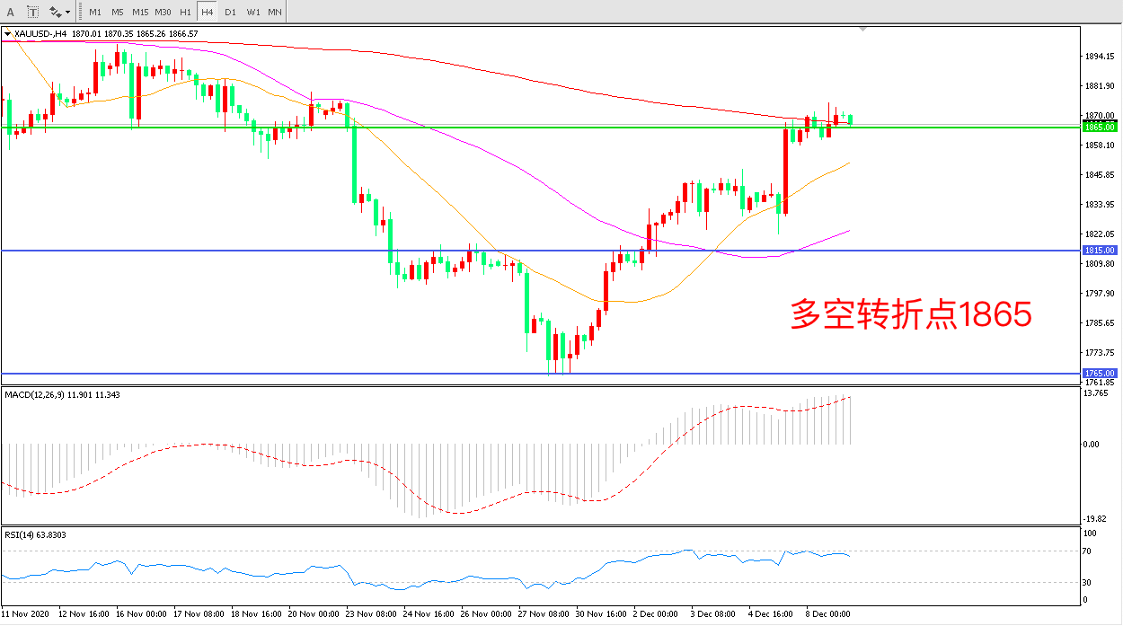 4小时图看,金价自低位大幅拉升,短期走势表现强势,1865被成功突破,200周期均线如能站稳,金价有望掀起新一轮的大涨,短期均线拐头向上,MACD红柱增加,RSI指标走平,日内震荡上行概率较大。