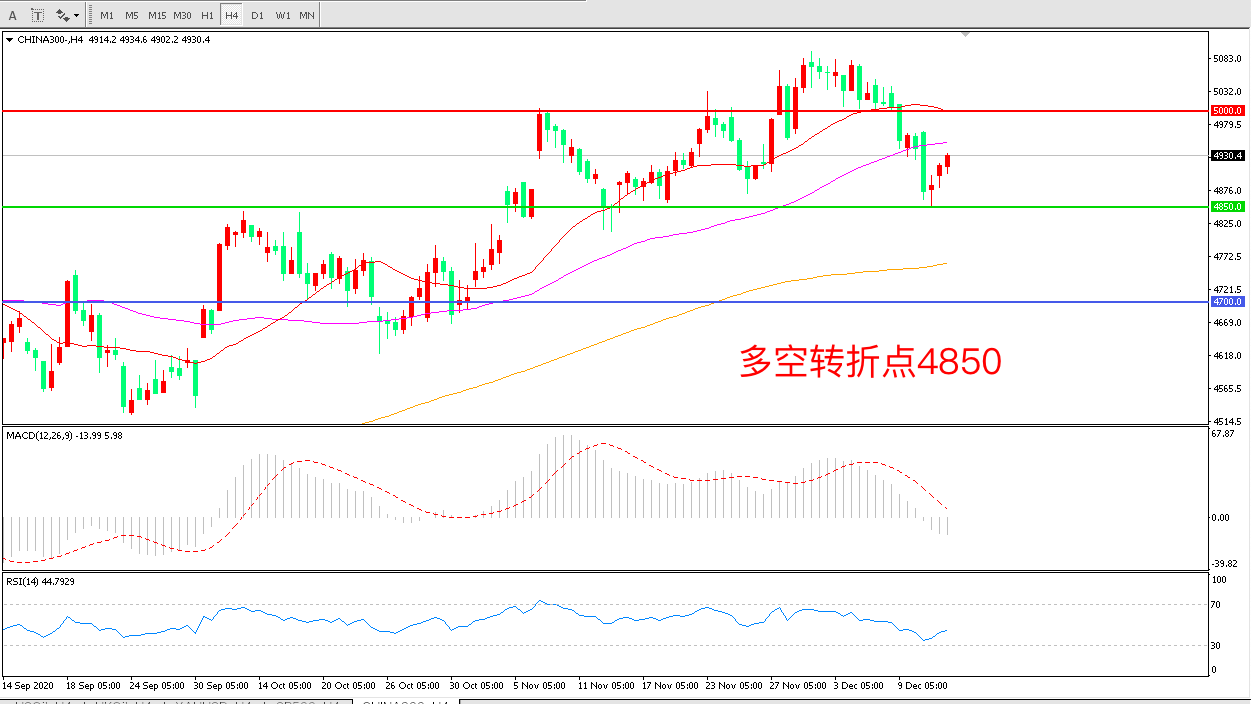 4小时图看,沪深3004850为依托小幅反弹短期表现有所回暖区间震荡迹象明显21周期均线成为上方阻力MACD红柱减少绿柱增加RSI指标向上,日内延续震荡概率较大。