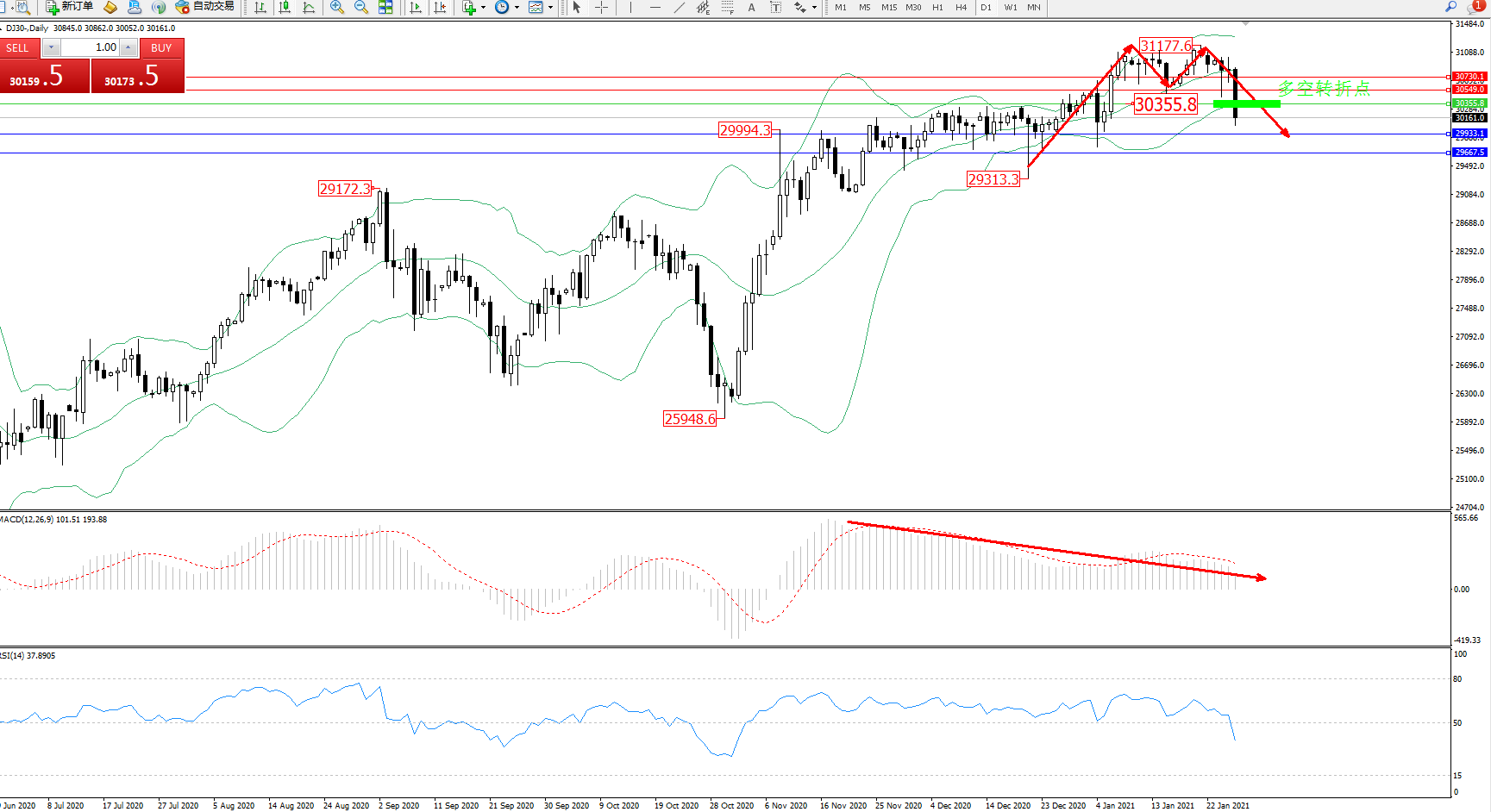 交易策略:30355下方看跌,目标29933、29667