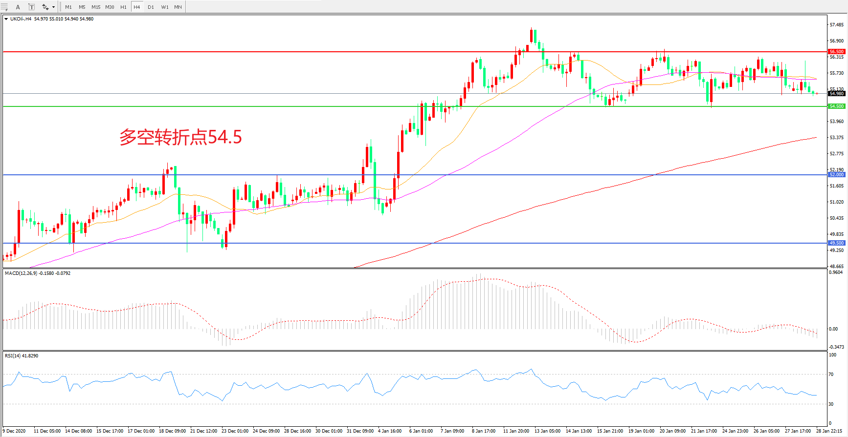 交易策略: 在54.50之上看涨,目标56.50 60.00