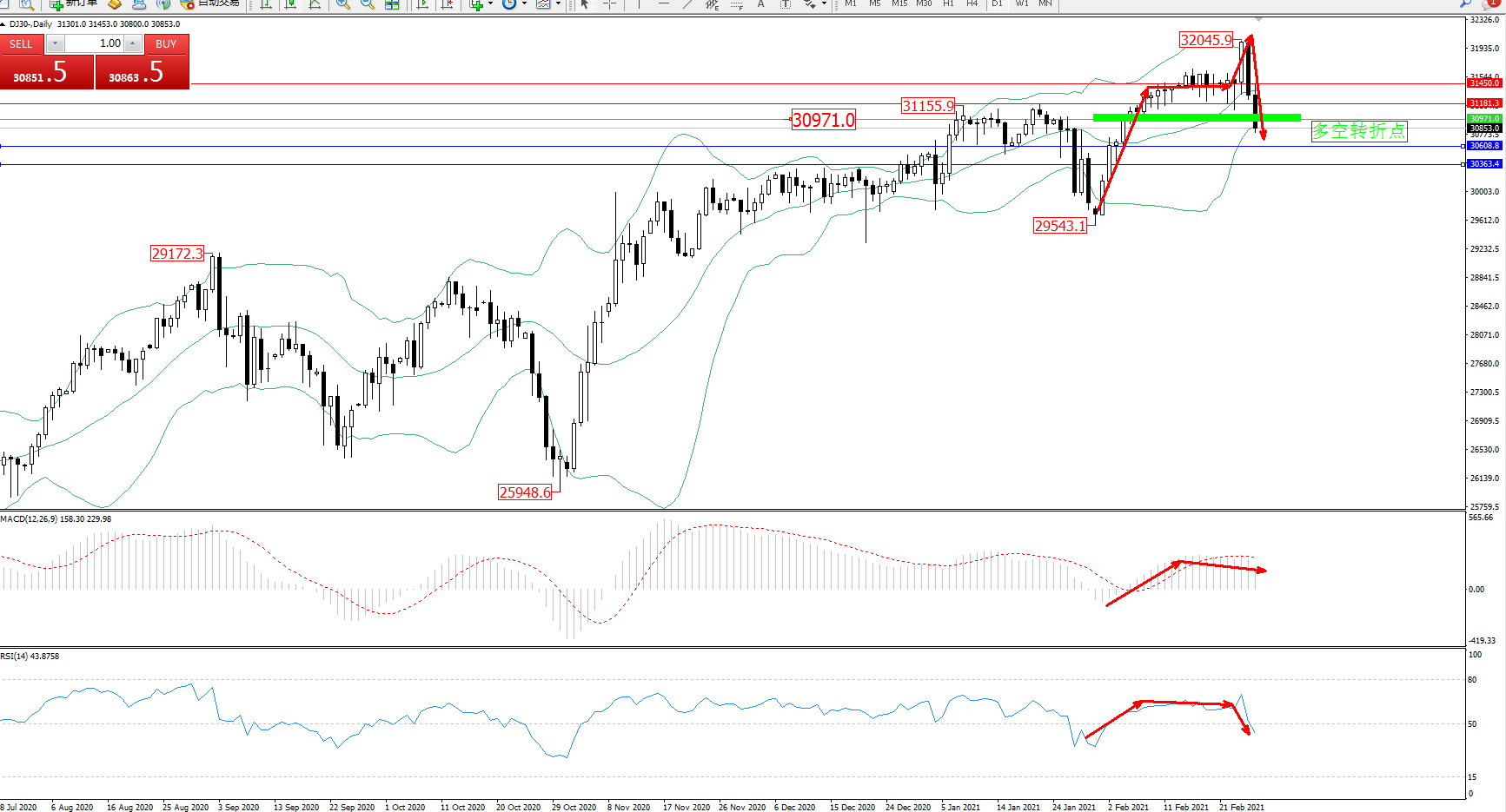 道琼斯指数指数2月26日(周五) 收盘下跌469.64点,跌幅1.50%,报30932.37点;美股三大股指涨跌互现,美国科技股在这个动荡一周的最后一天小幅反弹,因全球债券暴跌走势缓解,10年期美债收益率跌至1.5%以下。能源和银行股表现不佳,拖累道琼斯工业平均指数走低。全球债券持稳,因从亚洲到欧洲的央行试图平息市场的恐慌,美债收益率本周曾触及一年来的最高水平,并刺激了股市的下挫。投资者越来越担心通胀加剧会触发货币政策支持力度的回落,而风险资产在疫情期间的上涨主要受益于政策支持。较高的利率将造成投资者不愿再接受,尽管鲍威尔本周所说的话对经济有利,但对股市并不是特别有利。由于全球疫苗接种速度加快,以及对全球增长改善的乐观情绪,支撑了通胀将上升的押注,国债收益率飙升。这也导致投资者消化的收紧货币政策时间早于美联储和其他央行暗示的时间线。