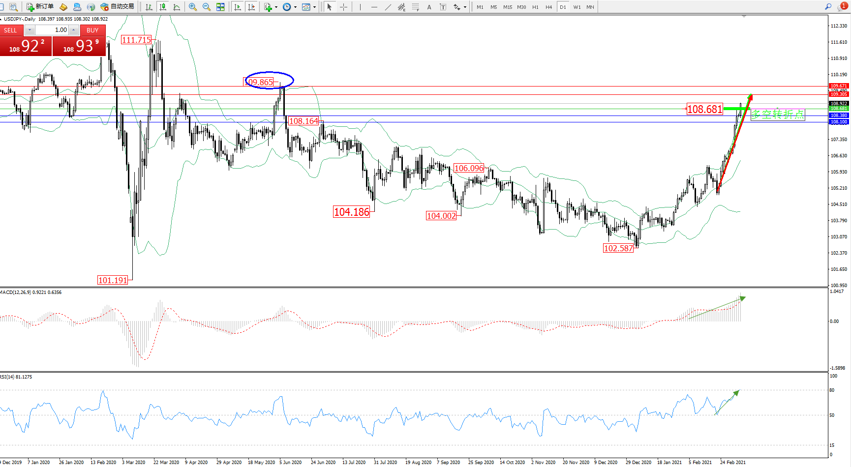 美元兑日圆强势拉升至108.910附近震荡,日本内阁府公布,尽管新冠病毒影响依旧,但受到畅旺出口和工业生产的支撑,1月同时指标在三个月来首次上升。1月同时指标初步较前月上升3.5点至91.7。该指标涵盖了工业生产、就业和零售销售等一系列数据。政府上调同时指标的评估,称经济处于转折点,正朝上升方向发展。日本2月银行存款创下最大同比增速,因新一波疫情促使家庭存钱多于支出。数据凸显出消费者感受到的切身之痛。疫情长期挥之不去,不但打击薪资增长,也可能使日本已然脆弱的经济复苏迟滞不前。2月日本银行整体存款为805.6万亿日圆(7.4万亿美元),较上年同期增长10%,增幅创下纪录。1月为增长9.8%。日本去年第四季经济环比年率扩张12.7%,得益于海外需求反弹,提振出口。日本经济当前季度将萎缩,因1月推出的紧急状态新限制举措打击消费。