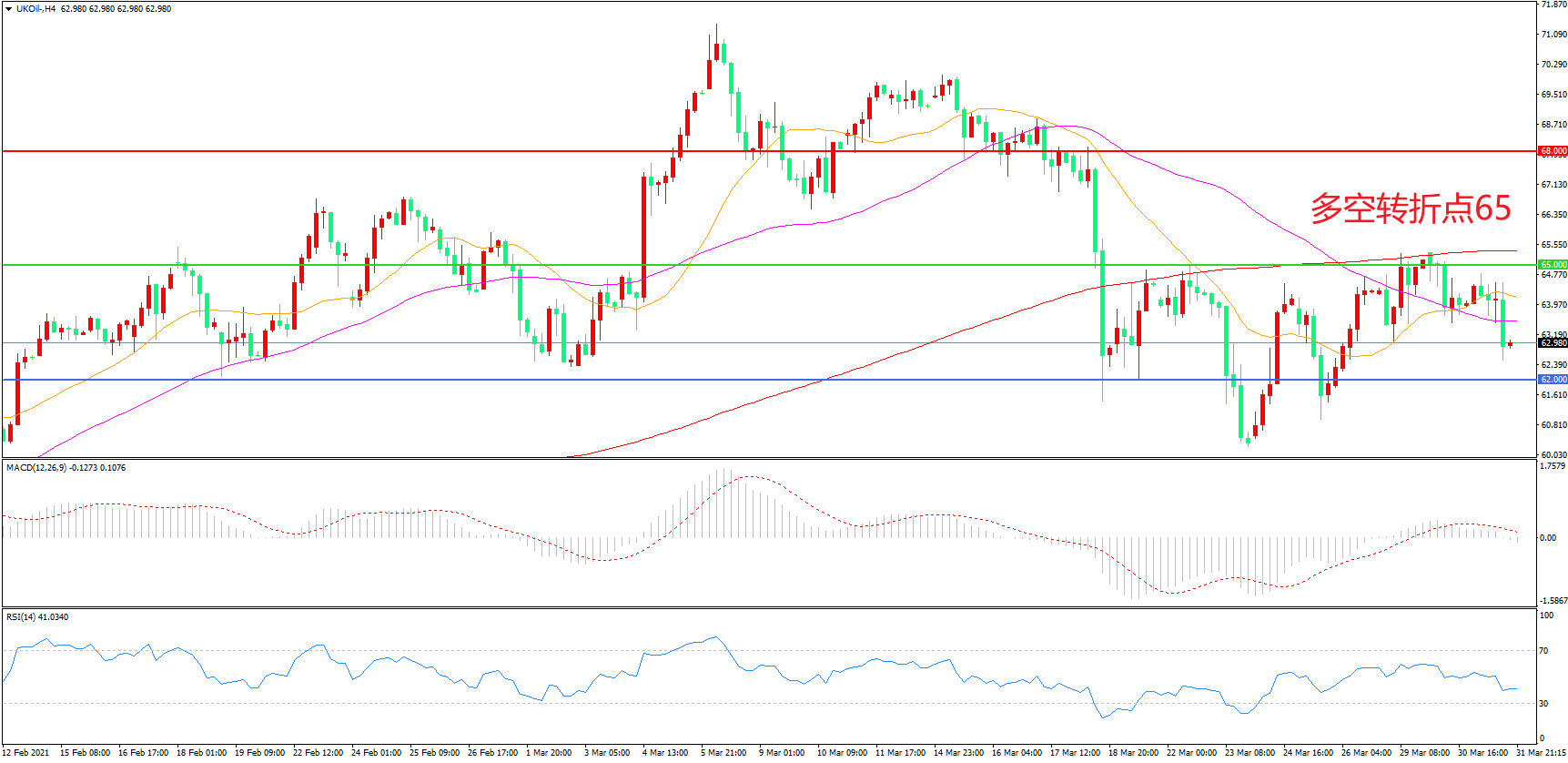4小时图看,油价触碰65美元后再度回落,短期走势偏弱,65美元成为上方阻力,62美元形成下方支撑,MACD红柱缩短,RSI指标走平,日内延续震荡概率较大。