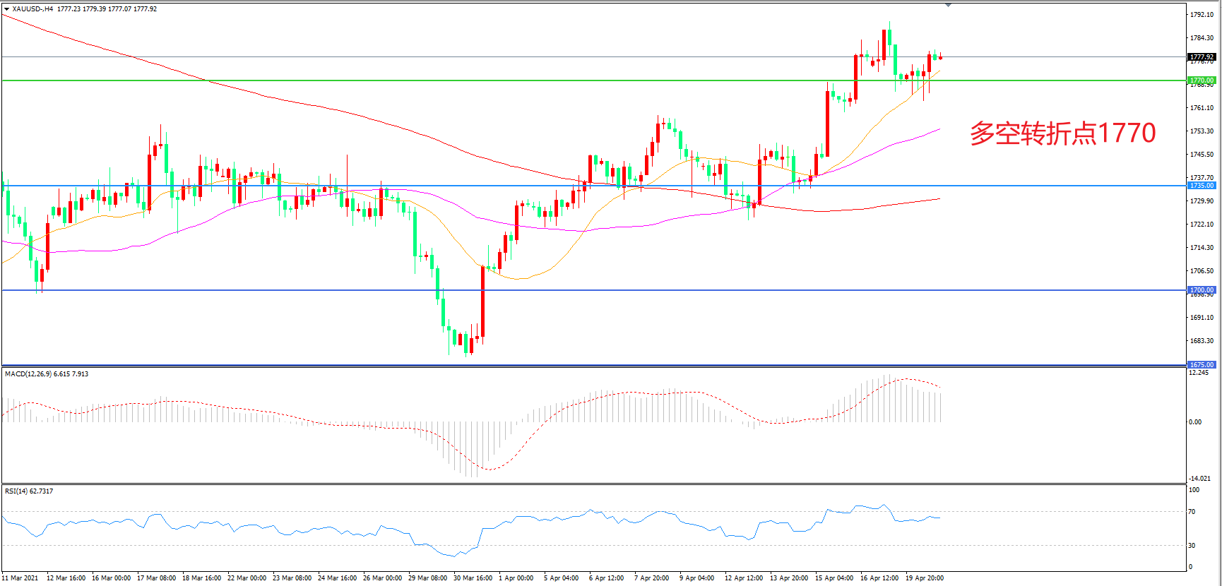 周二(4月20日),在上周触及5周低位后,美国10年期国债收益率重新站上1.6%,美债收益率反弹,抵消了美元走软对黄金的支撑,现货黄金延续高位窄幅震荡,收报1778.09美元/盎司。目前美联储已进入4月下旬会议前的噤声期,在出现另一个明确的推动因素之前,金价可能会维持在1760-1810美元/盎司的新区间。