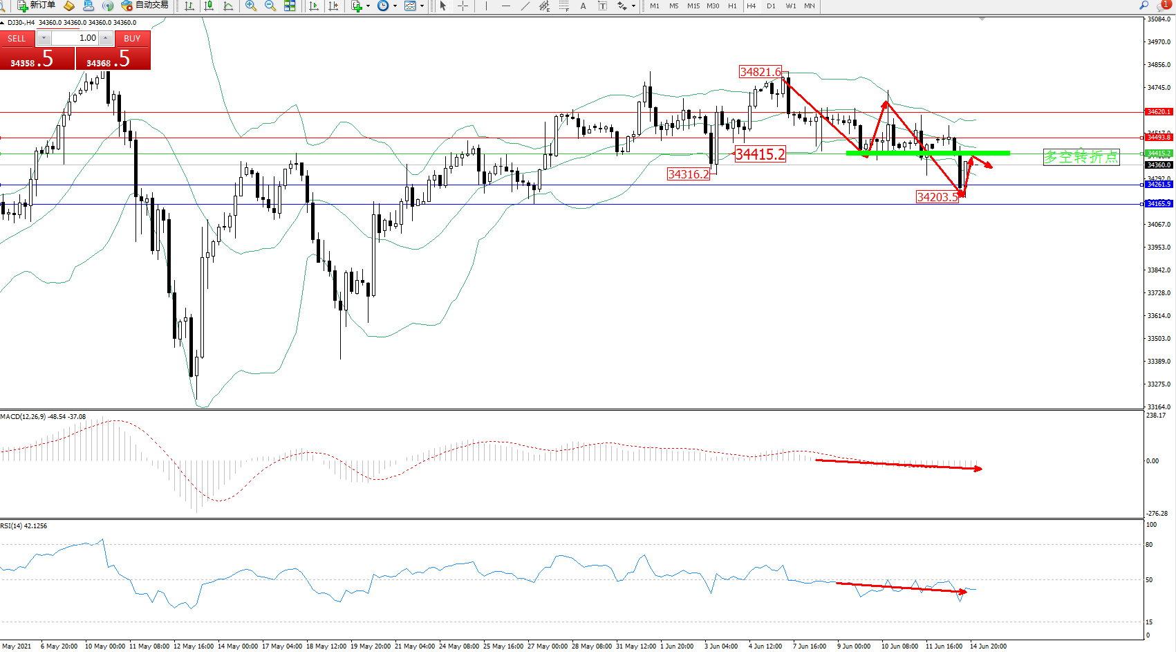 交易策略:34415下方看跌,目标34261、34165