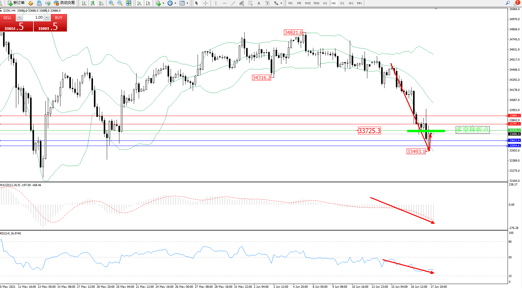 道琼斯指数DJ30——4小时K线图显示: