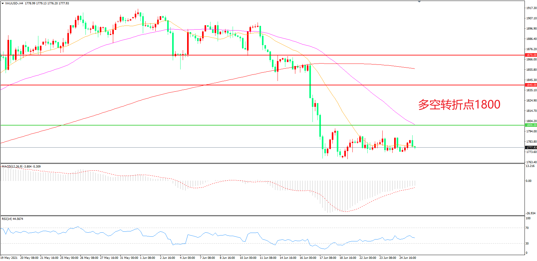 交易策略:在1800.00之下看跌,目标1760.00 1730.00