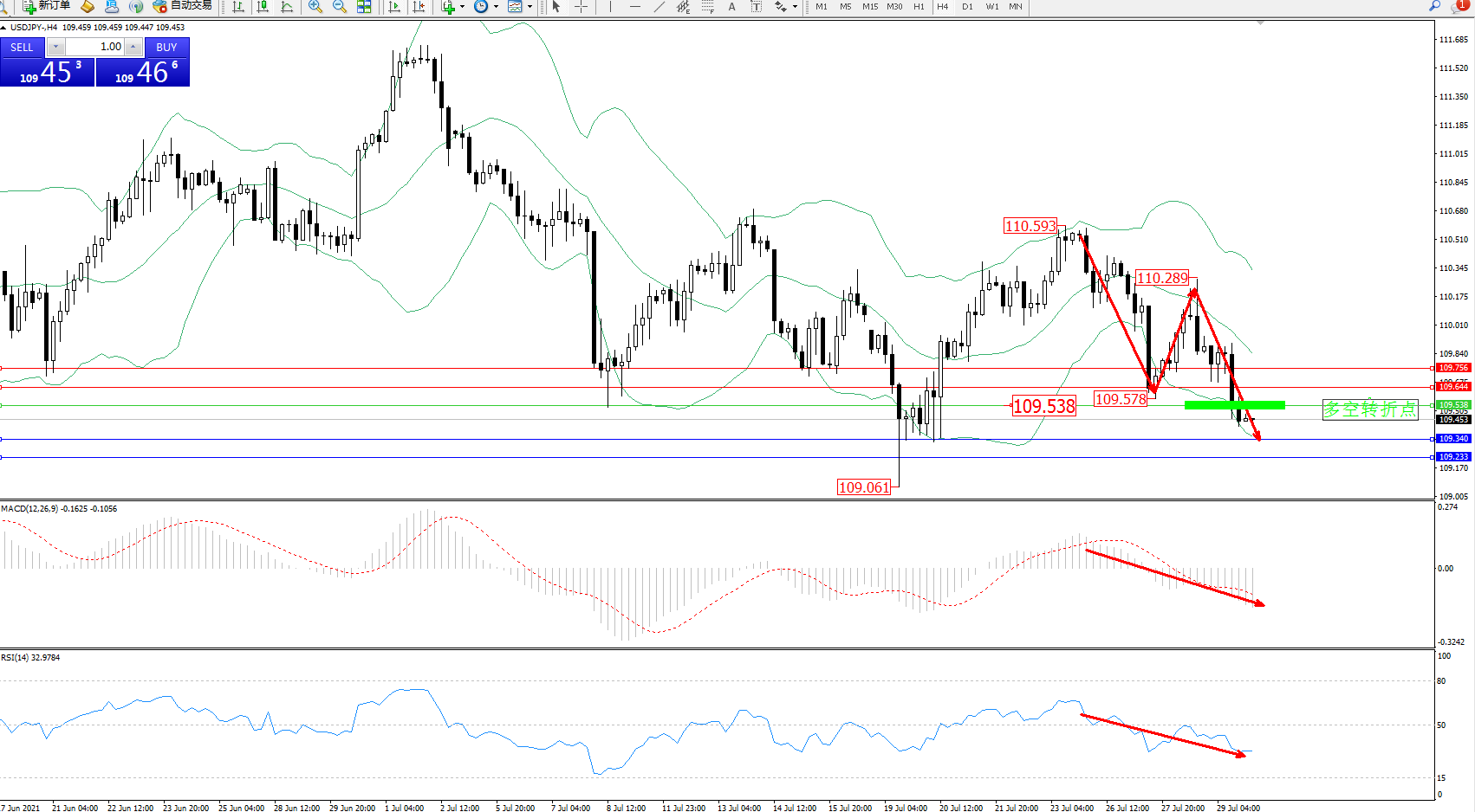 交易策略:109.538下方看跌,目标109.340、109.233