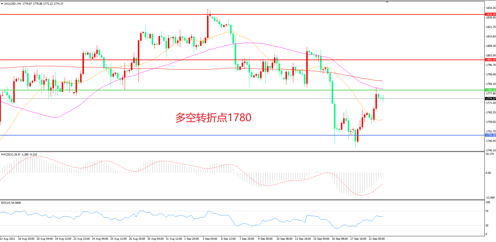 周二(9月21日),美联储货币政策会议首日,美元指数因避险需求减少而出现下滑,现货黄金持续攀升,突破1780美元/盎司高点后小幅回落,收报1776.25美元/盎司。目前所有的目光都集中于美联储公布的政策声明以及随后举行的新闻发布会,如果会后鲍威尔传达出收紧流动性的信号,将引发金价的巨幅波动,务必重点关注。