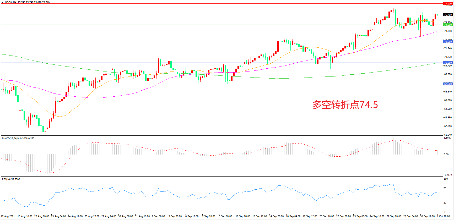 4小时图看,油价回踩21周期均线后再度拉升,短期表现较强,74.5美元成为短期多空分水岭,MACD红柱增加,RSI指标走平,日内延续上行概率较大。