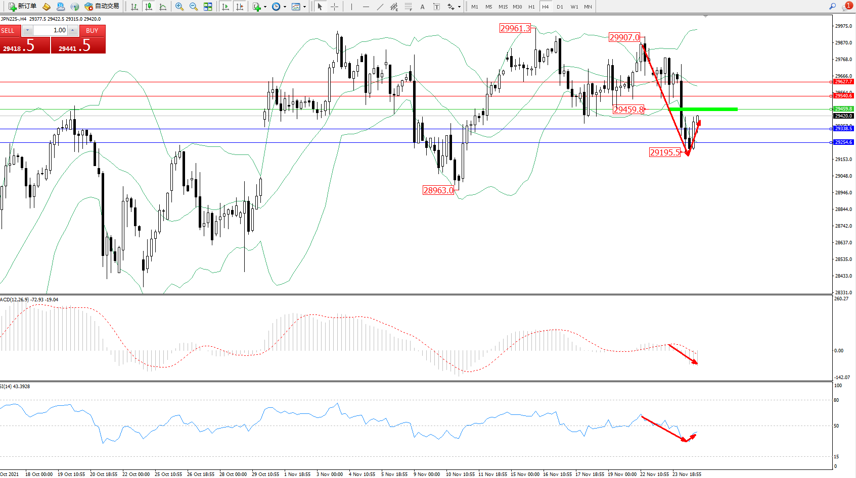 技术点评:长时间维持布林带指标通道内宽幅震荡,短期空头动力急速下挫,低位抵达29195位置节点后开始震荡,多头动力急速入场反转上移,但整体走势依旧处于空头下行,布林带指标呈张口走势持续中,MACD指标处于空头区域维持整理平移,RSI指标处于空头区域持续震荡;