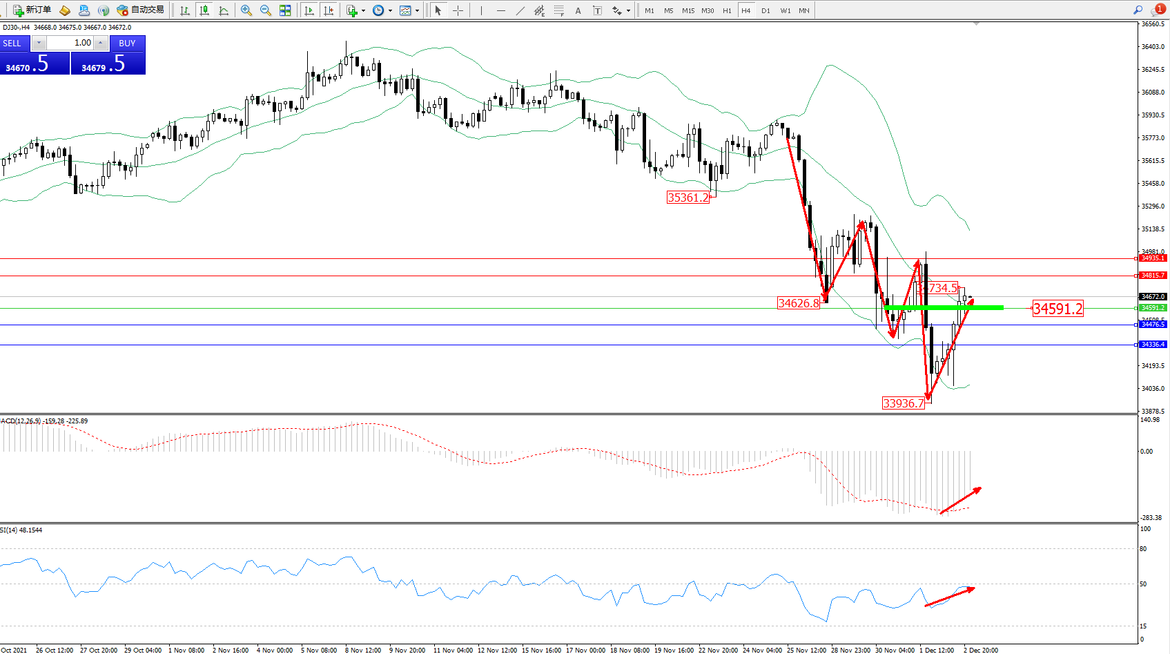 道琼斯指数DJ30——4小时K线图显示: