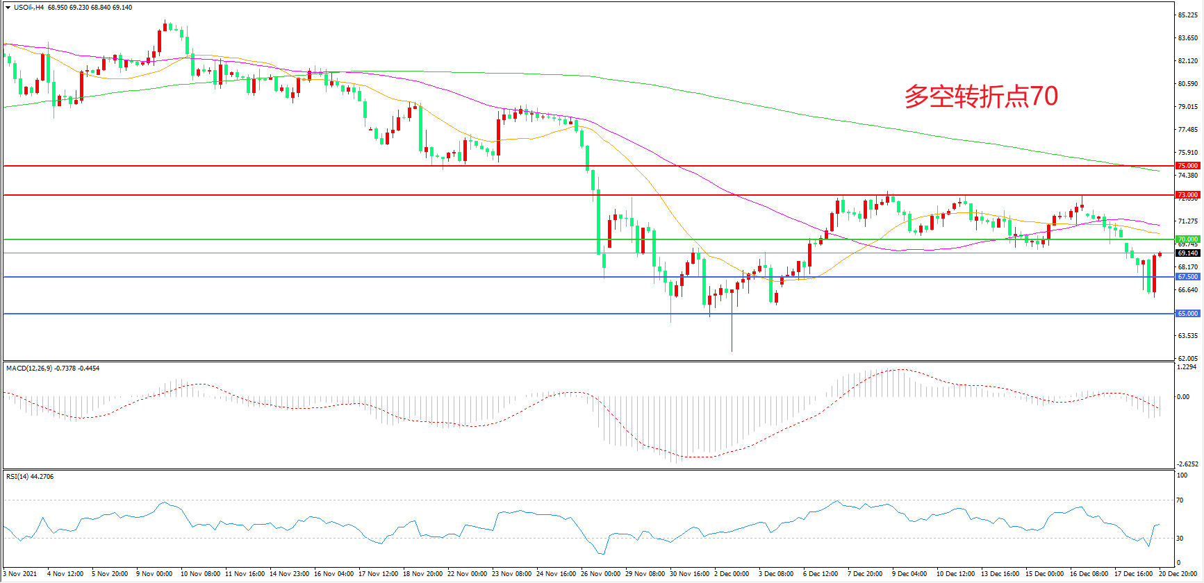 交易策略:在70.00之下看跌,目标67.50 65.00