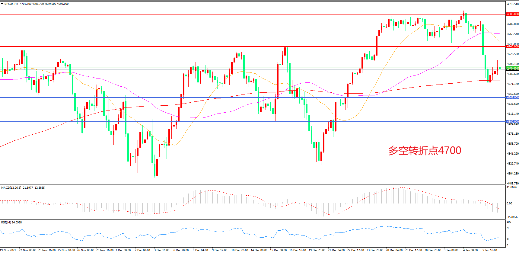 4小时图看,标普500长阴连续下破,空头趋势明显,4700成为多空分水岭,200均线成为短期支撑,MACD绿柱增加,RSI指标走平,日内震荡下行概率较大。