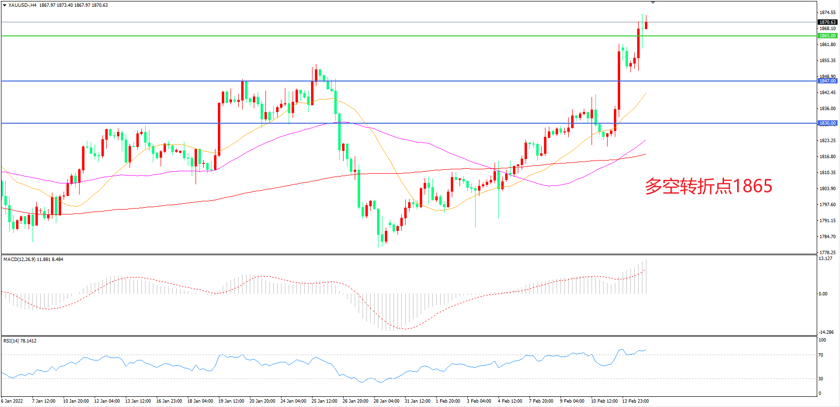 周一(2月14日),随着乌克兰局势持续紧张、欧美通胀屡创新高,大量资金寻求避险,现货黄金延续强势上行,收报1870.71美元/盎司。目前乌克兰紧张局势升级令市场恐慌情绪进一步发酵,若俄乌局势若进一步恶化导致西方国家制裁俄罗斯,金价将迎来更大幅度的上涨。