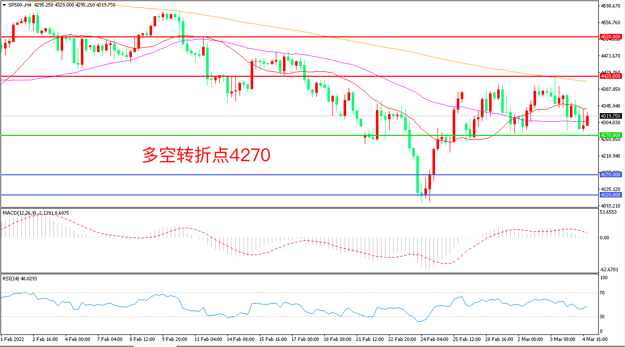 上周五(3月4日),商品高涨引发经济滞胀的担忧,标普500能源板块虽然走高,但金融和科技股下跌,最终收报4319.75点。目前俄乌局势持续影响市场,靓丽的非农就业报告再次为美国经济的“热度”增加数据上的注脚,加息逐步临近的情况下,美股延续宽幅震荡概率较大。