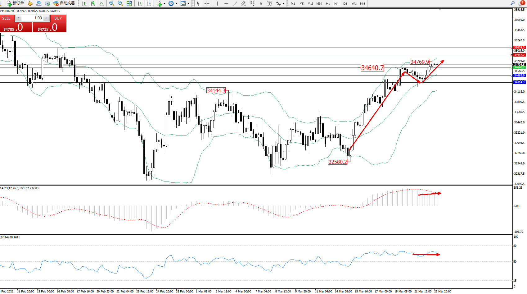 技术点评:多头动力延续布林带指标通道中上轨区间持续震荡上扬,高位抵达34769位置节点后开始整理,短期多头拉升上扬动力态势良好,布林带指标呈上行趋势走势后开始波幅空间收窄,MACD指标处于多头区域维持整理平移,RSI指标处于多头区域维持窄幅徘徊中;