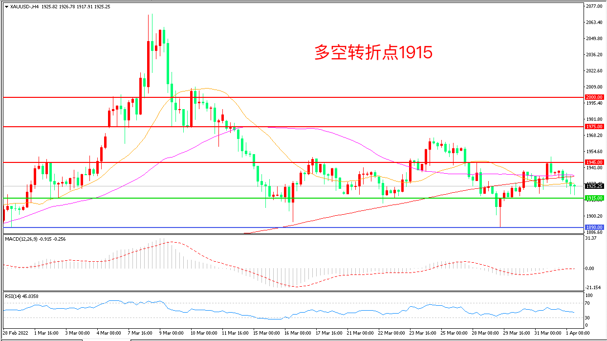 上周五(4月1日),非农就业数据新增43.1万人,略低于市场预期,受此影响美元指数探底回升,现货黄金震荡回落,收报1925.35点。目前投资者押注,美联储将在年底前再进行9次25个基点的加息,这意味着要在接下来的会议上加息50个基点,重点关注本周公布的美联储会议纪要,鹰派加息预期将对市场持续造成影响。