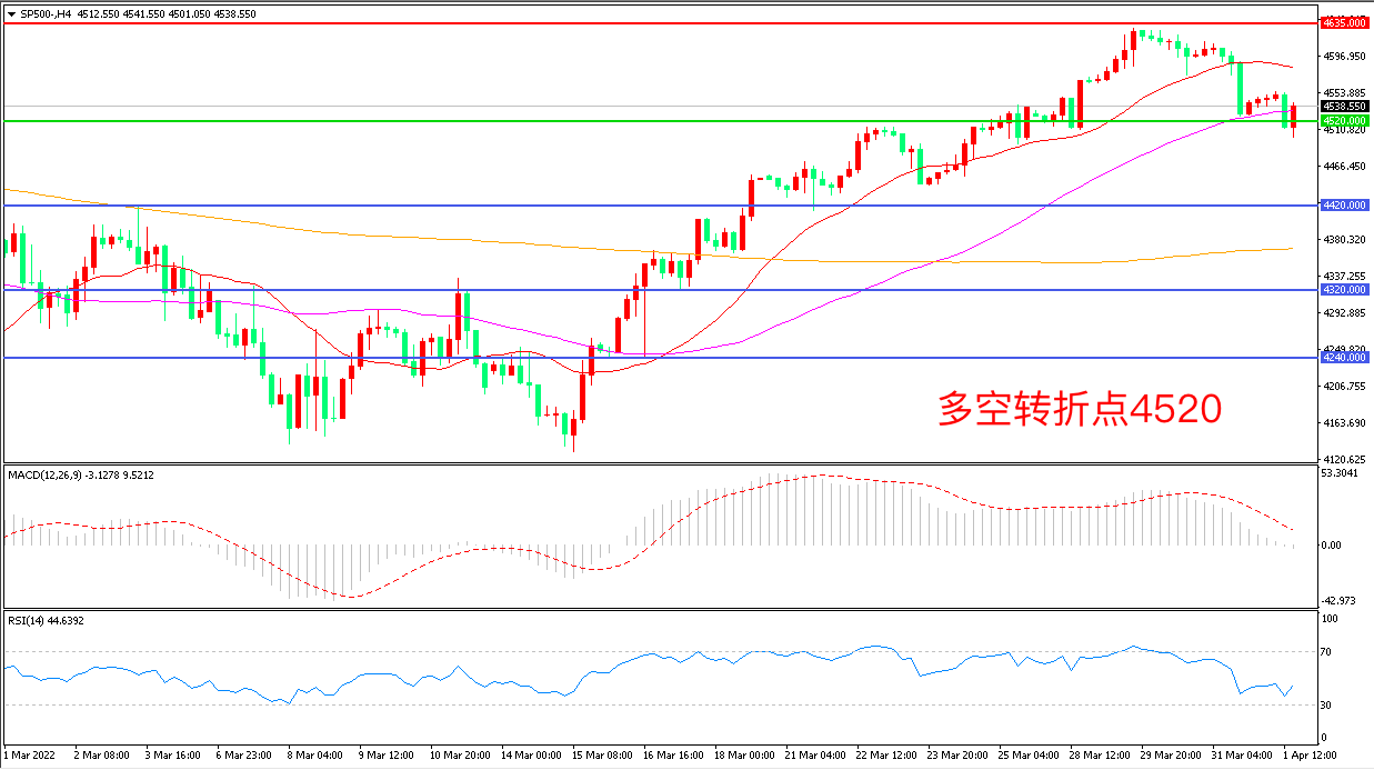 4小时图看,标普500触碰4635一线后大幅回落,55周期均线成为下方支撑,4520成为多空分水岭,MACD红柱缩短,RSI指标走平,日内震荡上行概率较大。