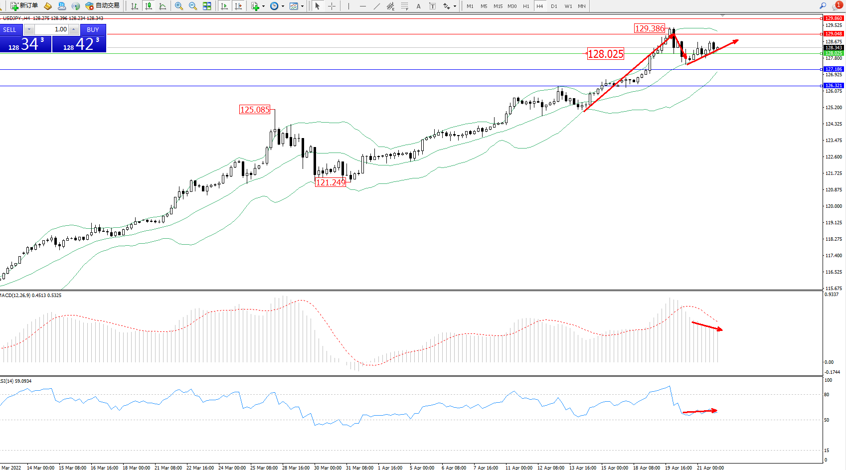 交易策略:128.025上方看涨,目标129.048、129.860