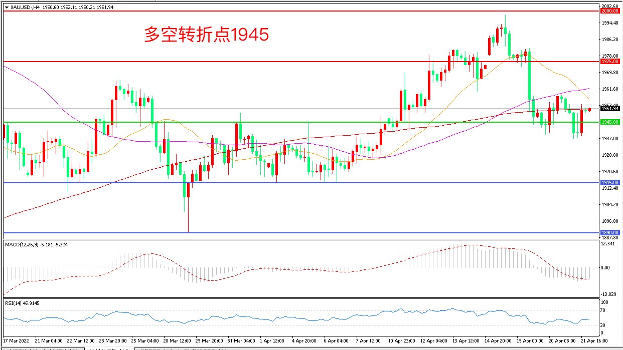 周四(4月21日),美联储主席鲍威尔称下次联储会议将讨论加息50个基点,本是鸽派的旧金山联储主席戴利同样发表鹰派表态,联储高层的强势发言对金价形成压力,现货黄金先跌后涨,收报1951.66美元/盎司。目前投资者在俄乌冲突加剧、美联储加息和通胀飙升的多重影响中反复权衡,预计中期金价仍以宽幅震荡为主。
