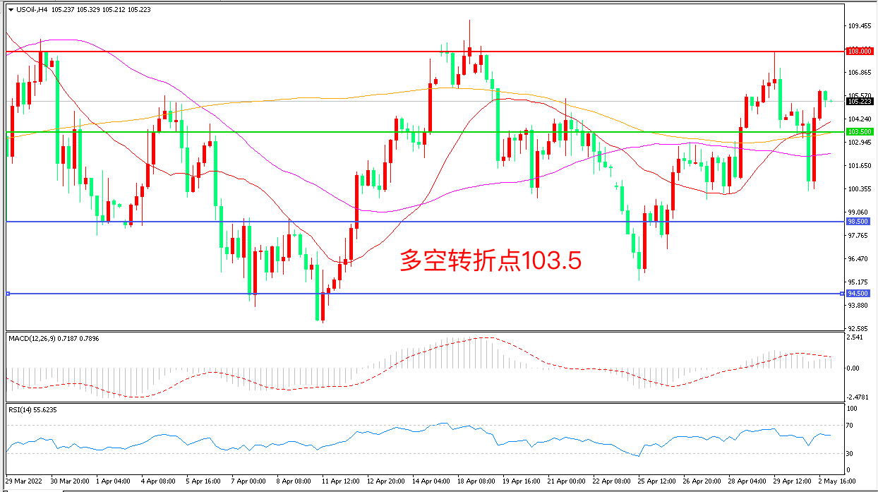 周一(5月2日),欧洲联盟各成员国能源部长在比利时首都布鲁塞尔举行会议,讨论针对俄罗斯的新一轮制裁,德国威胁立即对俄罗斯石油实施禁运,美国WTI原油先跌后涨,收报105.21美元/桶。目前包括匈牙利、意大利、奥地利和希腊在内的一些欧盟成员国,仍对禁运俄石油的经济影响持谨慎态度,多重因素干扰下,油价预计仍延续宽幅震荡态势。