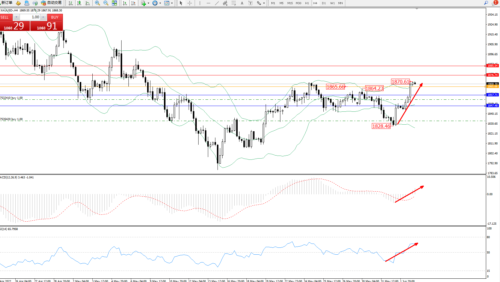交易策略:1865上方看涨,目标1876、1885