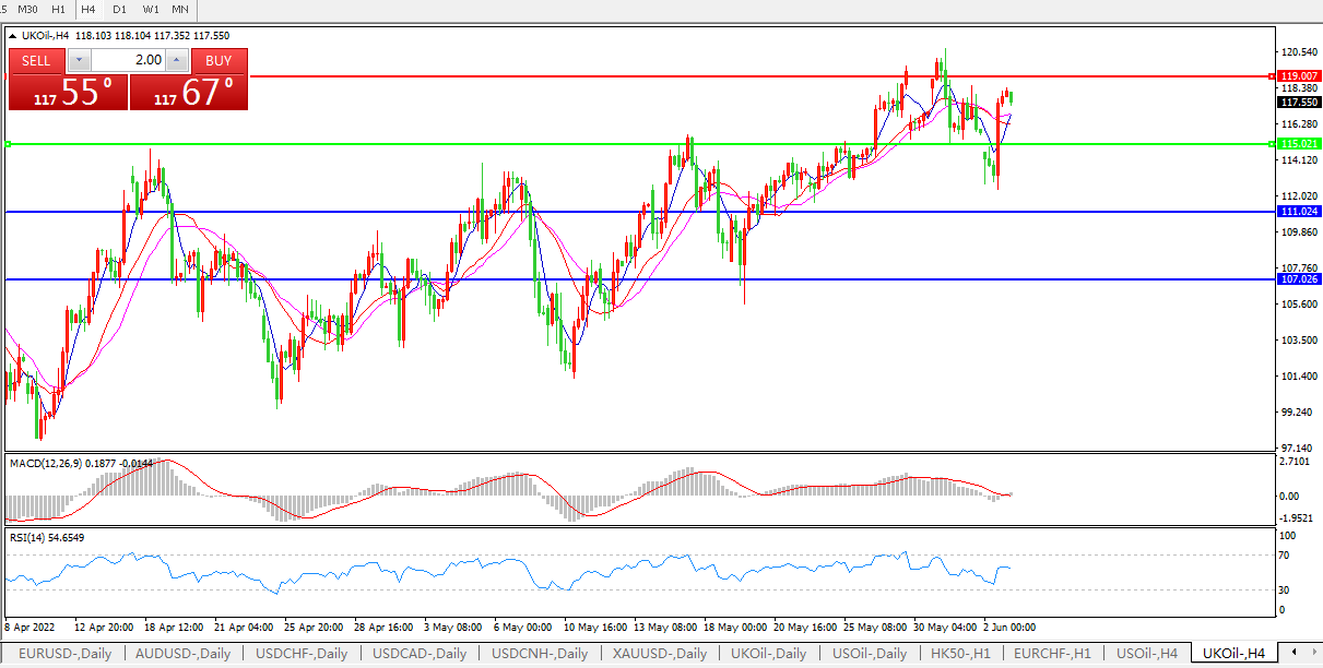 4小时图看,油价迅速拉升,短线走势仍旧坚韧 MACD量能柱缩短RSI指标再度回升,日内延续高位宽幅整理概率较大。