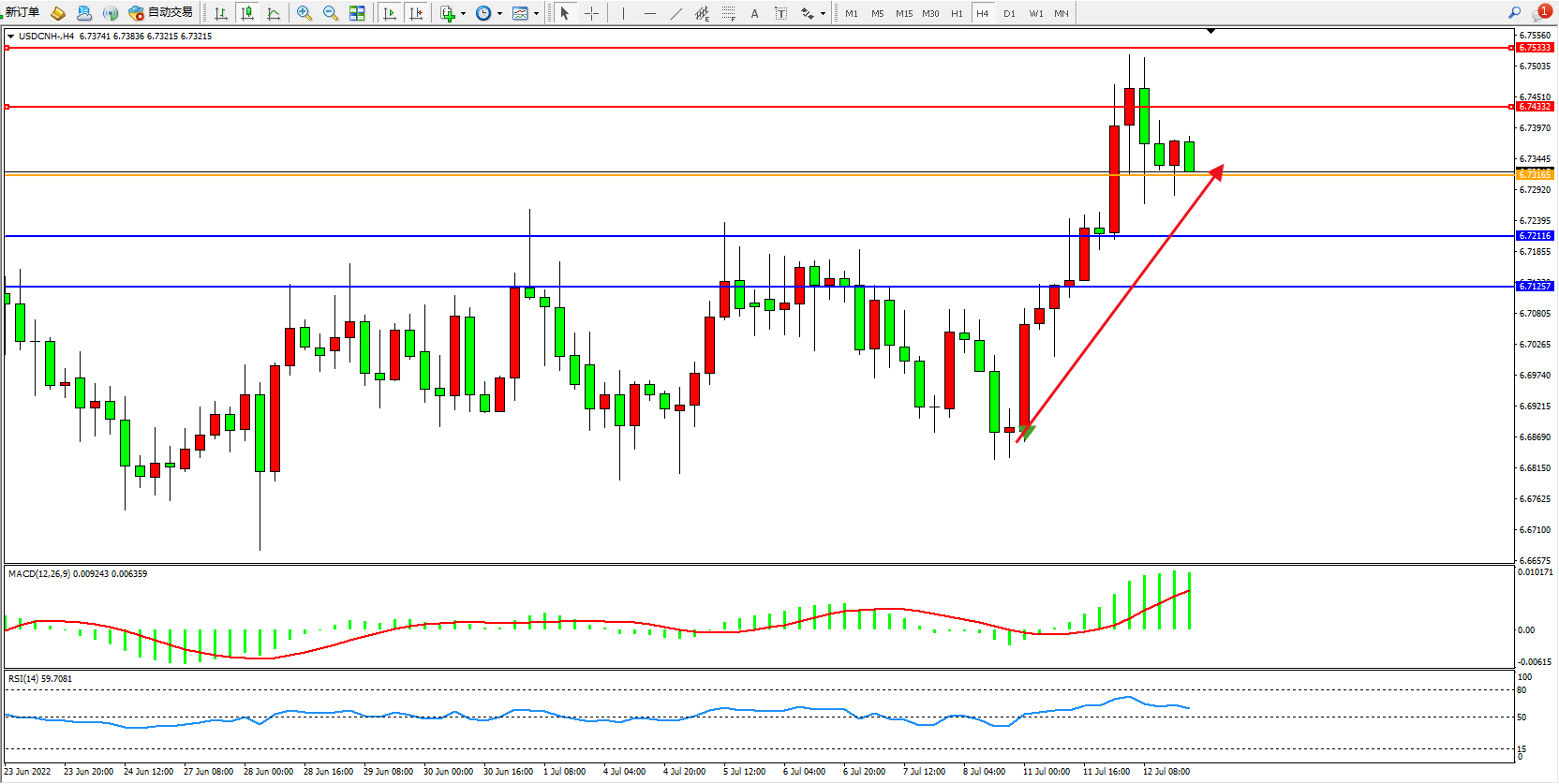 交易策略:6.73165上方看涨,目标6.74332、6.75333