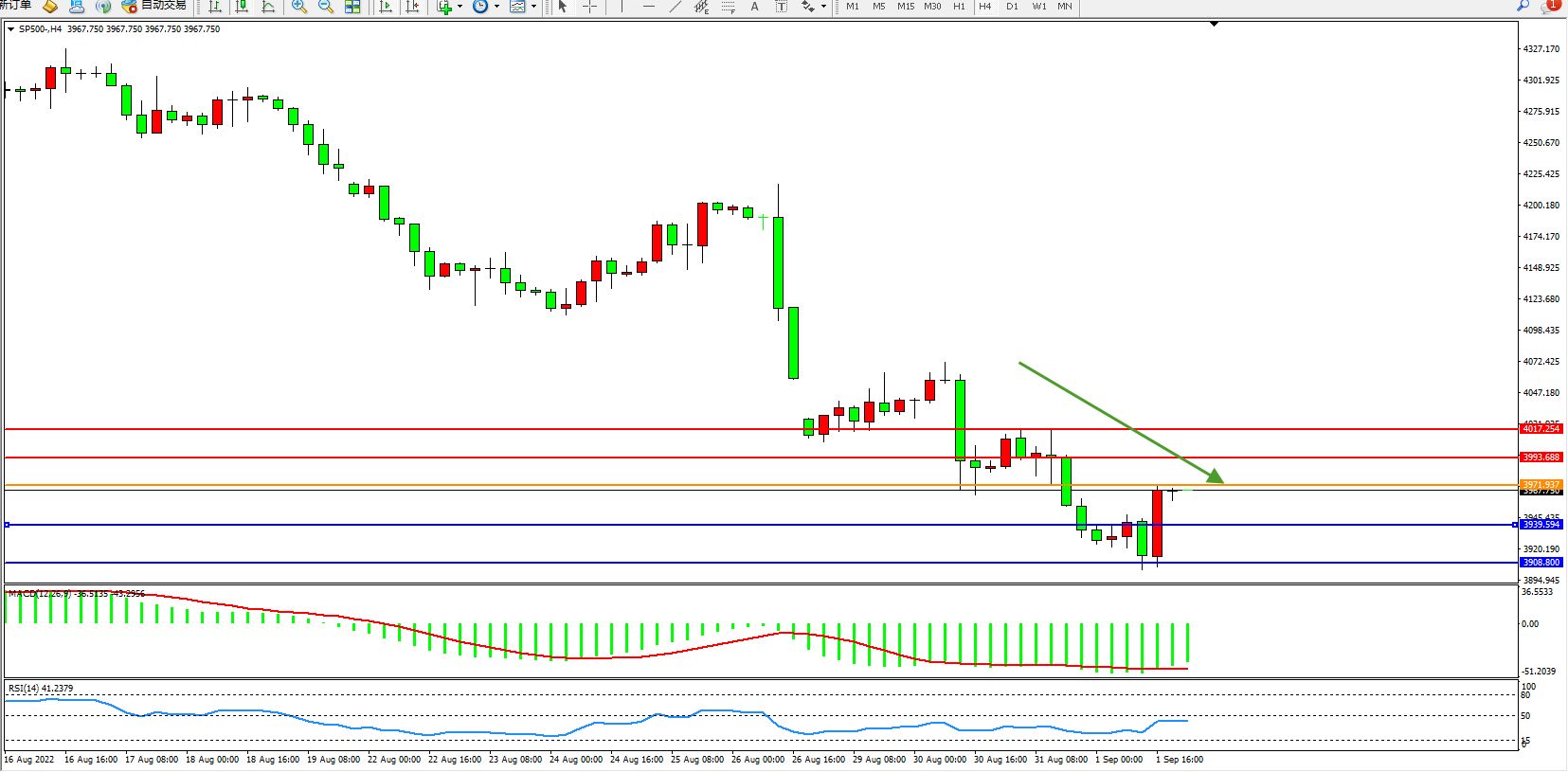 标普SP500——4小时K线图显示: