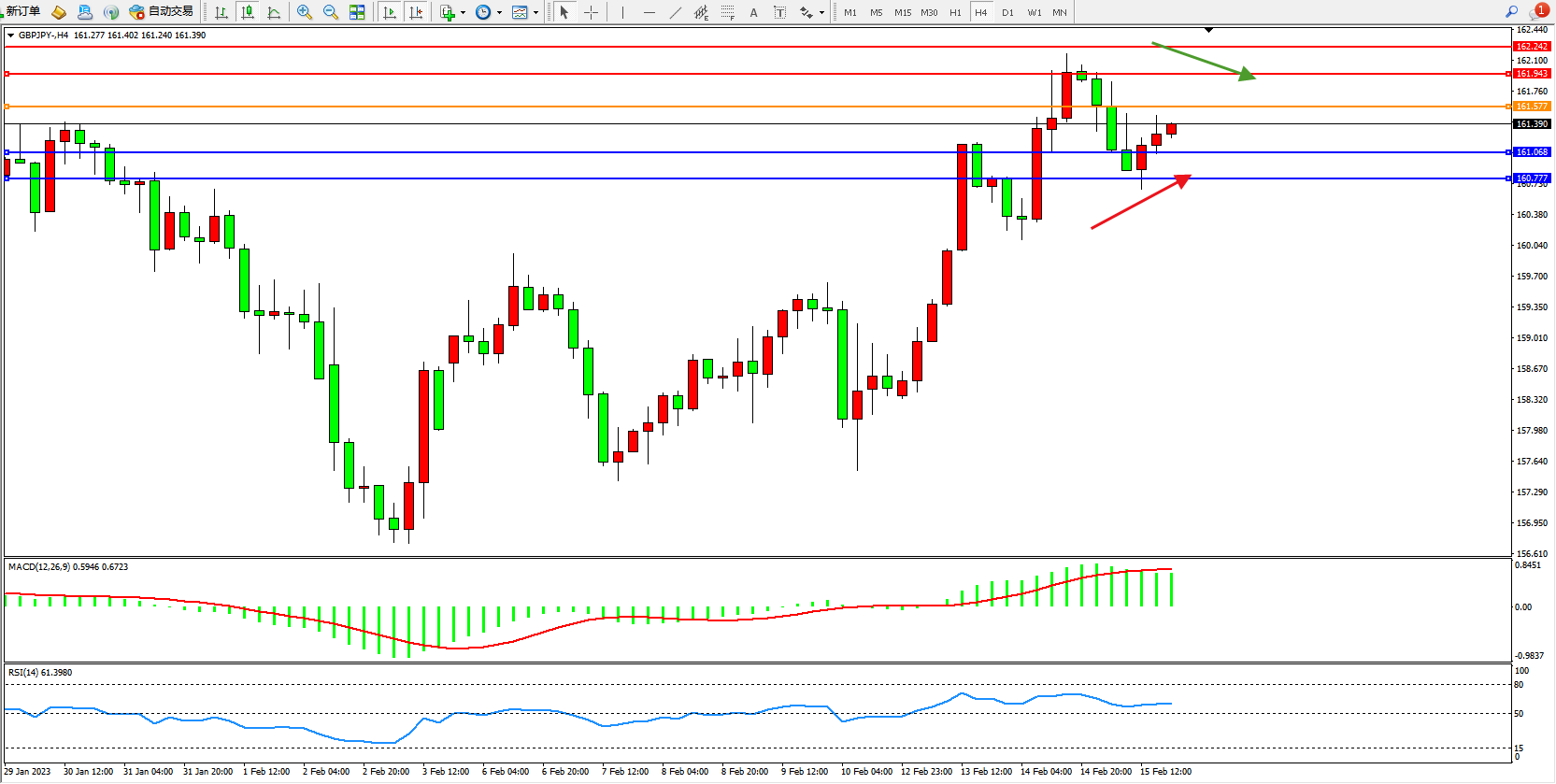 交易策略:161.577下方看跌,目标161.068、160.777